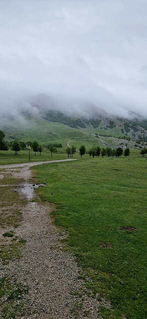 El camino va haciendo zigzag y vamos subiendo hacia el collado de Elorrola, siempre siguiendo las señales rojas y blancas de la Gran Ruta. Llegamos al puerto y vemos agradecidos el descenso. Llegamos a la Ermita de Andra Mari de Urbia (1924), que dejaremos a nuestra izquierda para seguir por el camino de tierra y llegar hasta el refugio de Urbia, donde podríamos haber tomado un buen refresco en el bar del refugio, si no estuviera cerrado, utilizamos los bancos de la entrada para descansar tomar algo que llevábamos y refugiarnos un rato de la ligera lluvia.